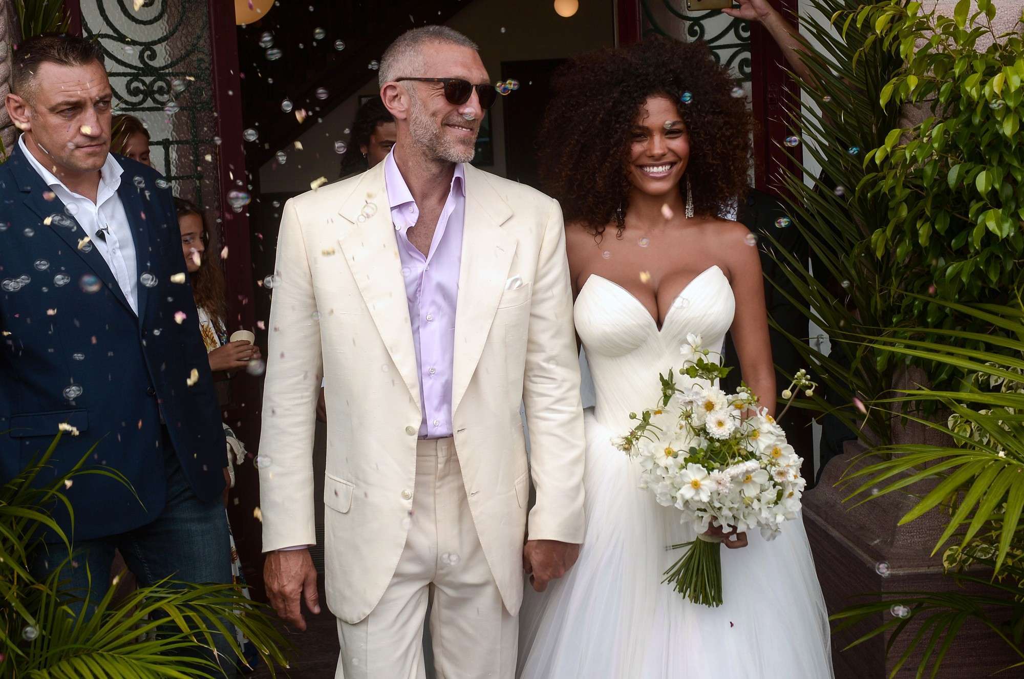 O ator francês Vincent Cassel e a modelo francesa Tina Kunakey após a cerimônia de casamento, na França
